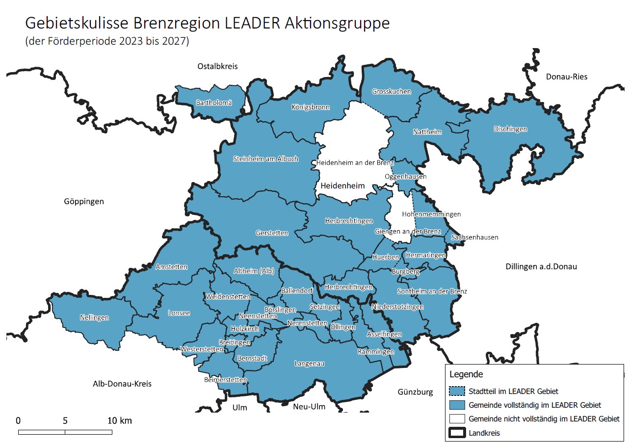 Das Förderprogramm LEADER der Europäischen Union unterstützt Projekte, die die Lebensqualität in ländlichen Regionen durch wirtschaftliche Entwicklung, Nachhaltigkeit und soziale Teilhabe stärken. Verantwortlich für die Umsetzung des LEADER-Programms vor Ort ist die LEADER-Aktionsgruppe Brenzregion. Die Förderkulisse, also das Gebiet, in dem Projekte gefördert werden, erstreckt sich über den Landkreis Heidenheim hinaus bis in den Ostalbkreis (Gemeinde Bartholomä) und den nördlichen Alb-Donau-Kreis.
